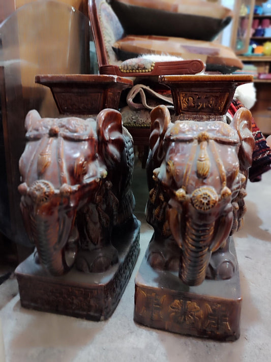 Un par de magníficos taburetes de jardín con forma de elefante de cerámica esmaltada