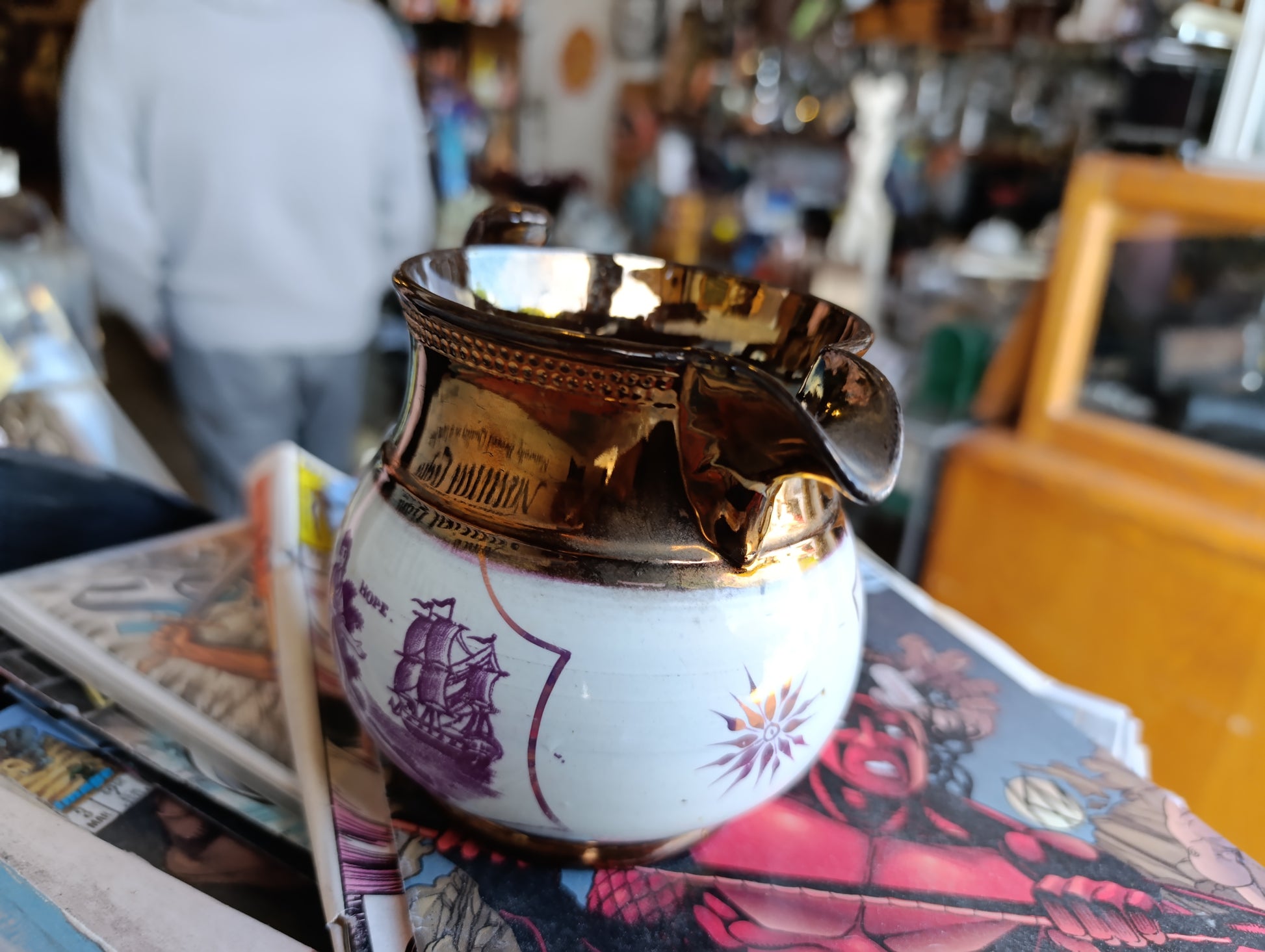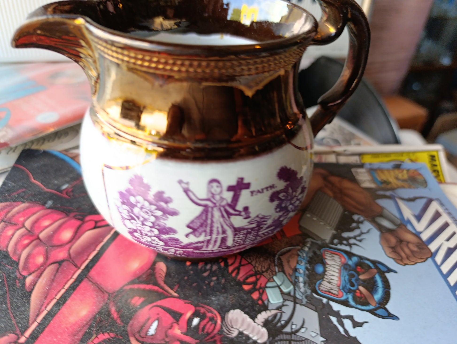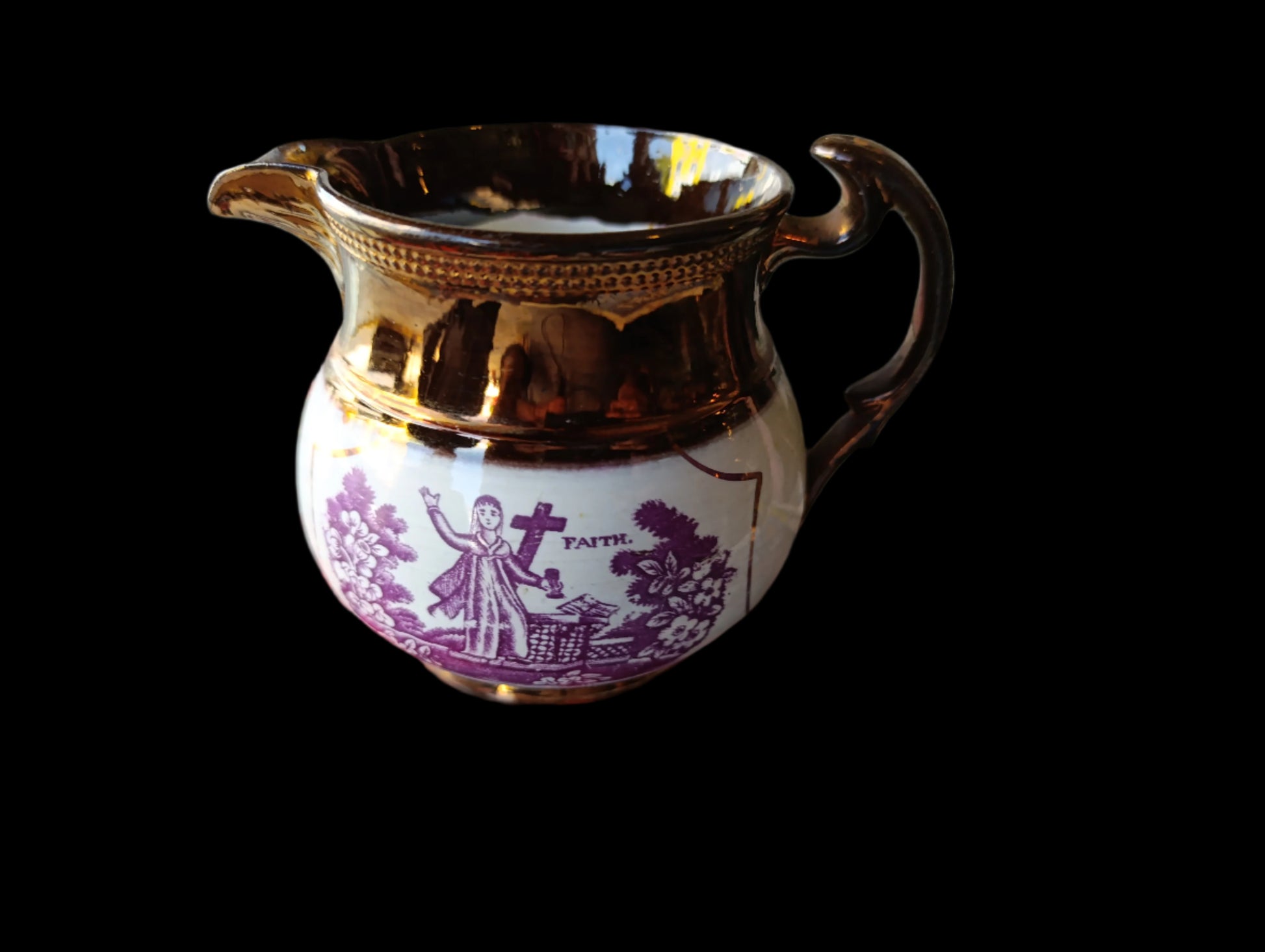 Jarra Antigua Inglesa Sunderland Lustreware Rosa Cobre | “Hope and Faith” | Década de 1830